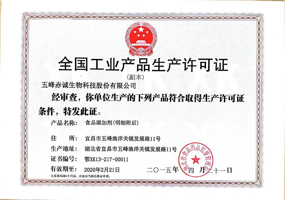4月21日, 五峰赤誠生物科技股份有限公司食品添加劑食用單寧酸、沒食子酸丙酯獲得湖北省食品藥品監(jiān)督管理局頒發(fā)的全國工業(yè)產(chǎn)品生產(chǎn)許可證。證書編號:鄂XK13-217-00011,有效期至2020年2月21日。 沒食子酸丙酯產(chǎn)品于2014年9月9日取得湖北省農(nóng)業(yè)廳頒發(fā)的飼料添加劑生產(chǎn)許可證,證書編號:鄂飼添(2014)t05005,有效期至2019年9月8日。