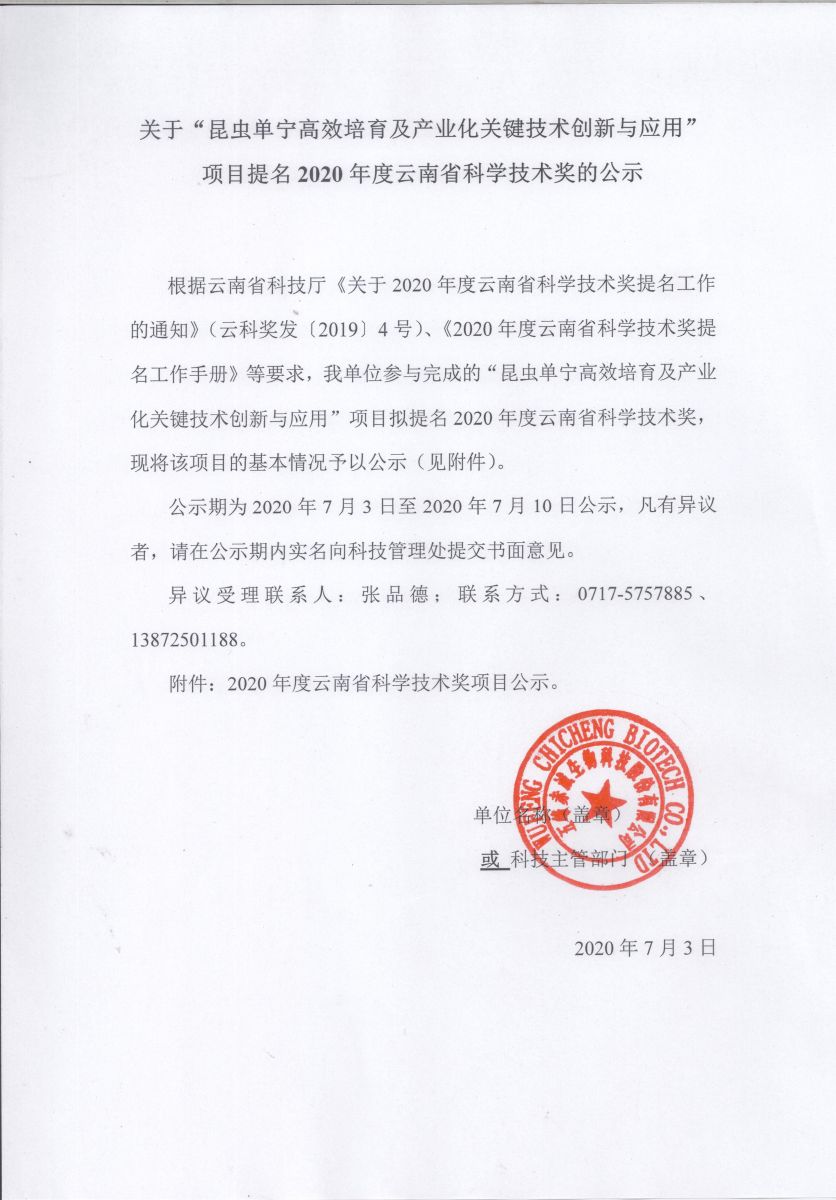 關(guān)于“昆蟲單寧高效培育及產(chǎn)業(yè)化關(guān)鍵技術(shù)創(chuàng)新與應(yīng)用”項目提名2020年度云南省科學(xué)技術(shù)獎公示